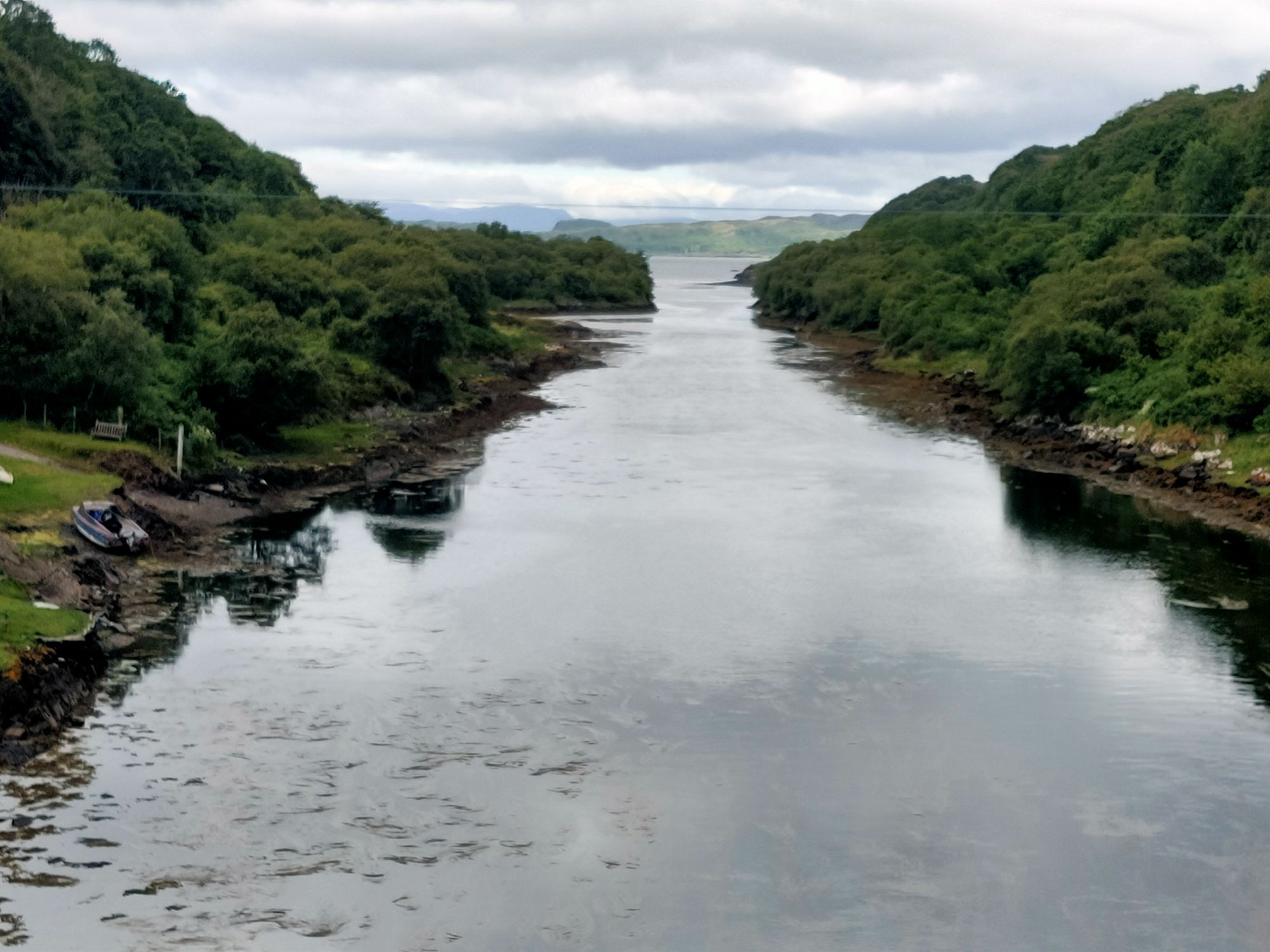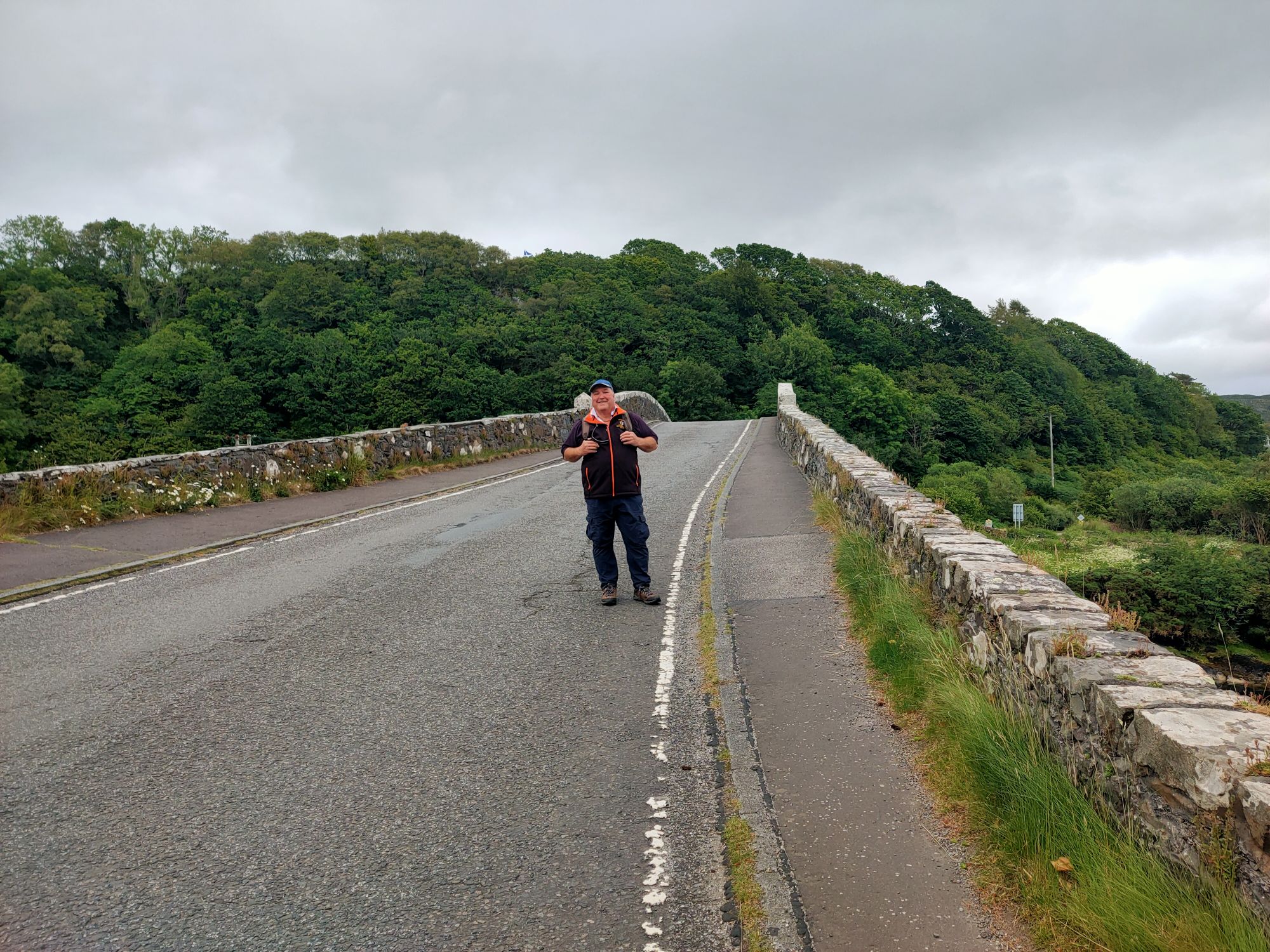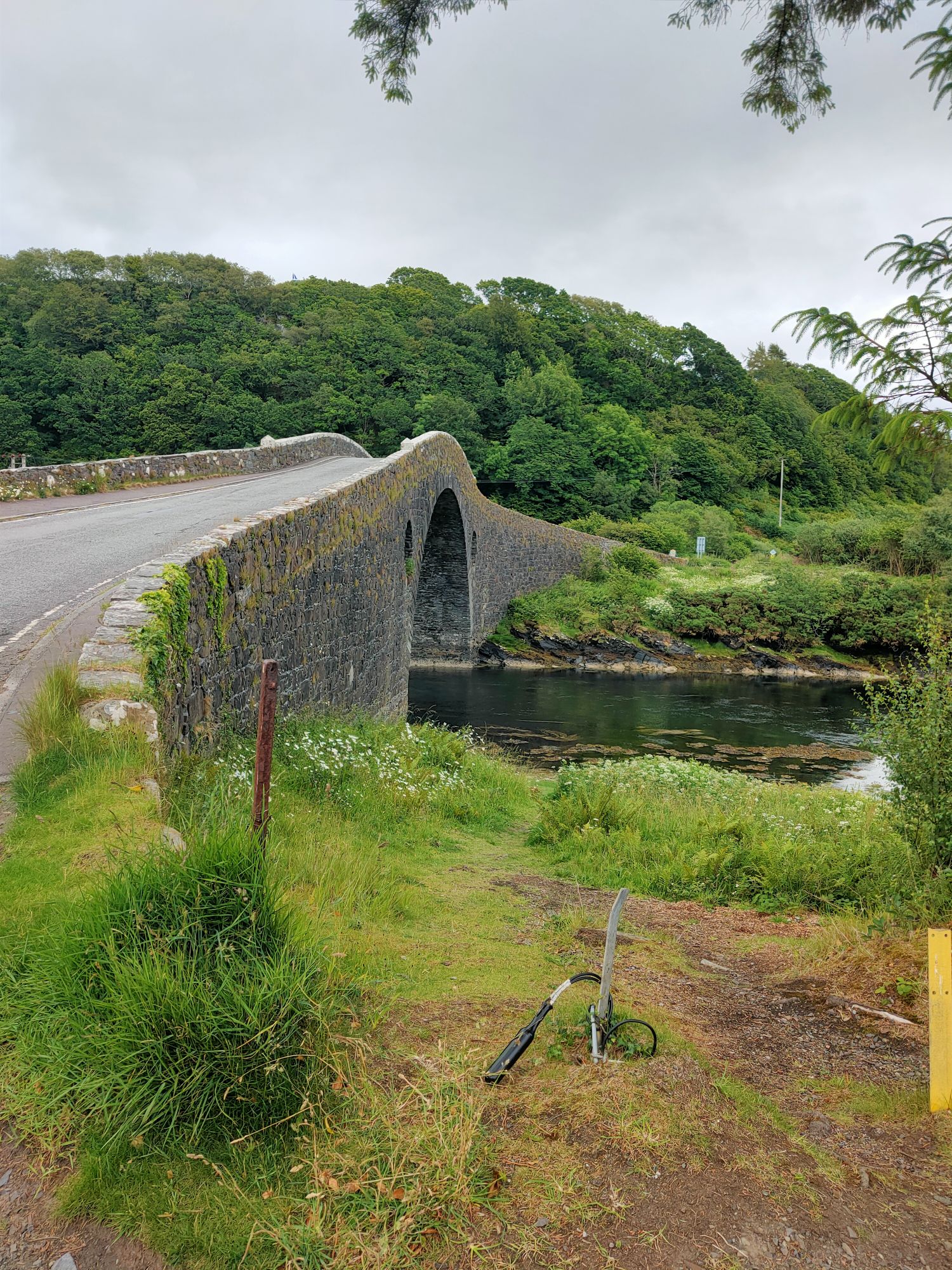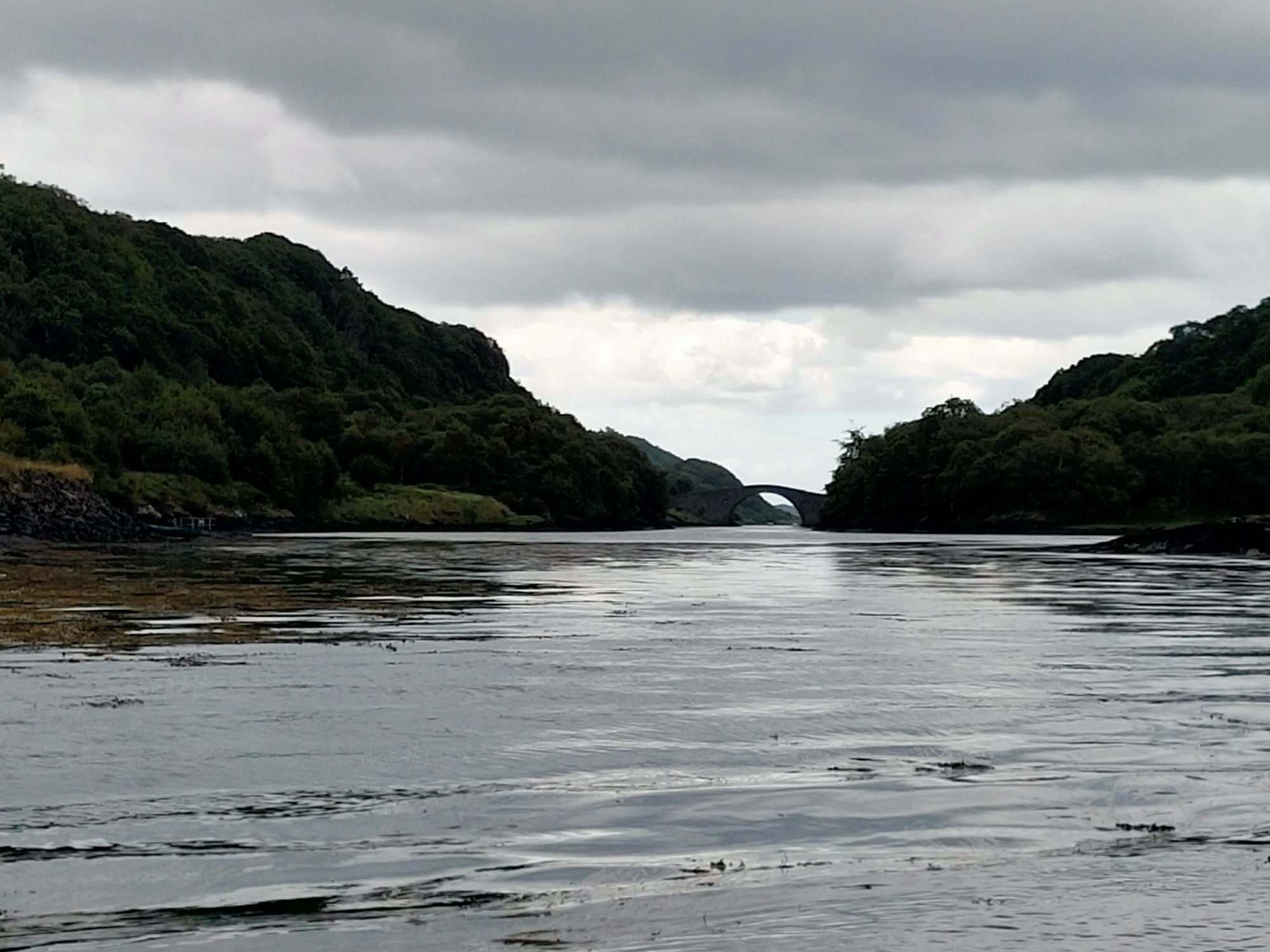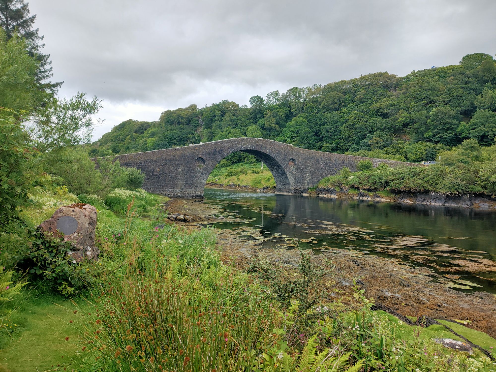 We launched the dinghy and headed ashore., the early morning blue skies were ominously clouding over. There was an adventure to be had the other side of Seil Island to the east of the anchorage. The well trodden path lead over the hill (the highest point in Seil Island is 83m and this wasn’t it), then down amongst the trees to Tigh an Truish. This was reputedly the place where the Scots exchanged their banned kilts for trousers before venturing further onto the mainland. The pub doesn’t open its doors til noon and wasn’t our goal. This morning we intended to cross the Atlantic! In fact we crossed it twice on foot, stopping to look at the rare fairy foxgloves which grow on the Clachan Bridge but sadly were past their best now.
