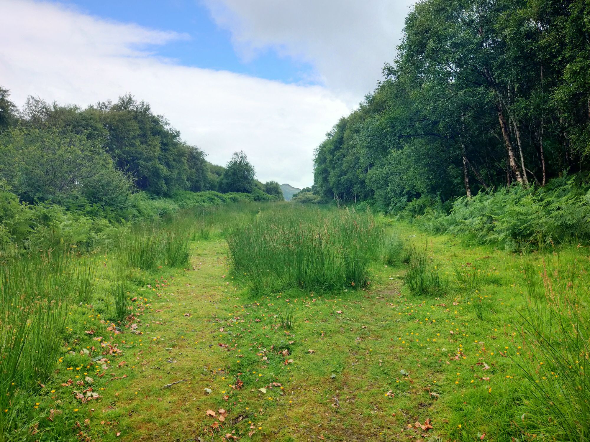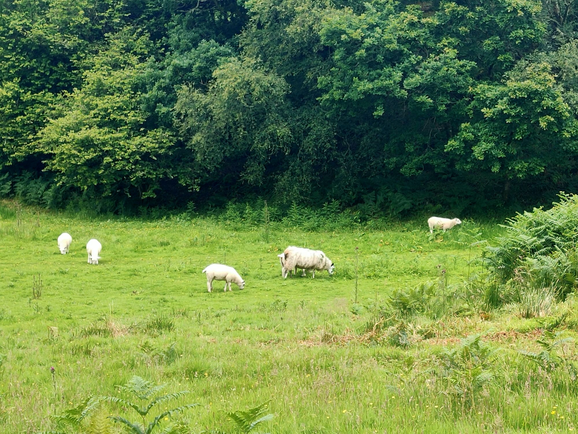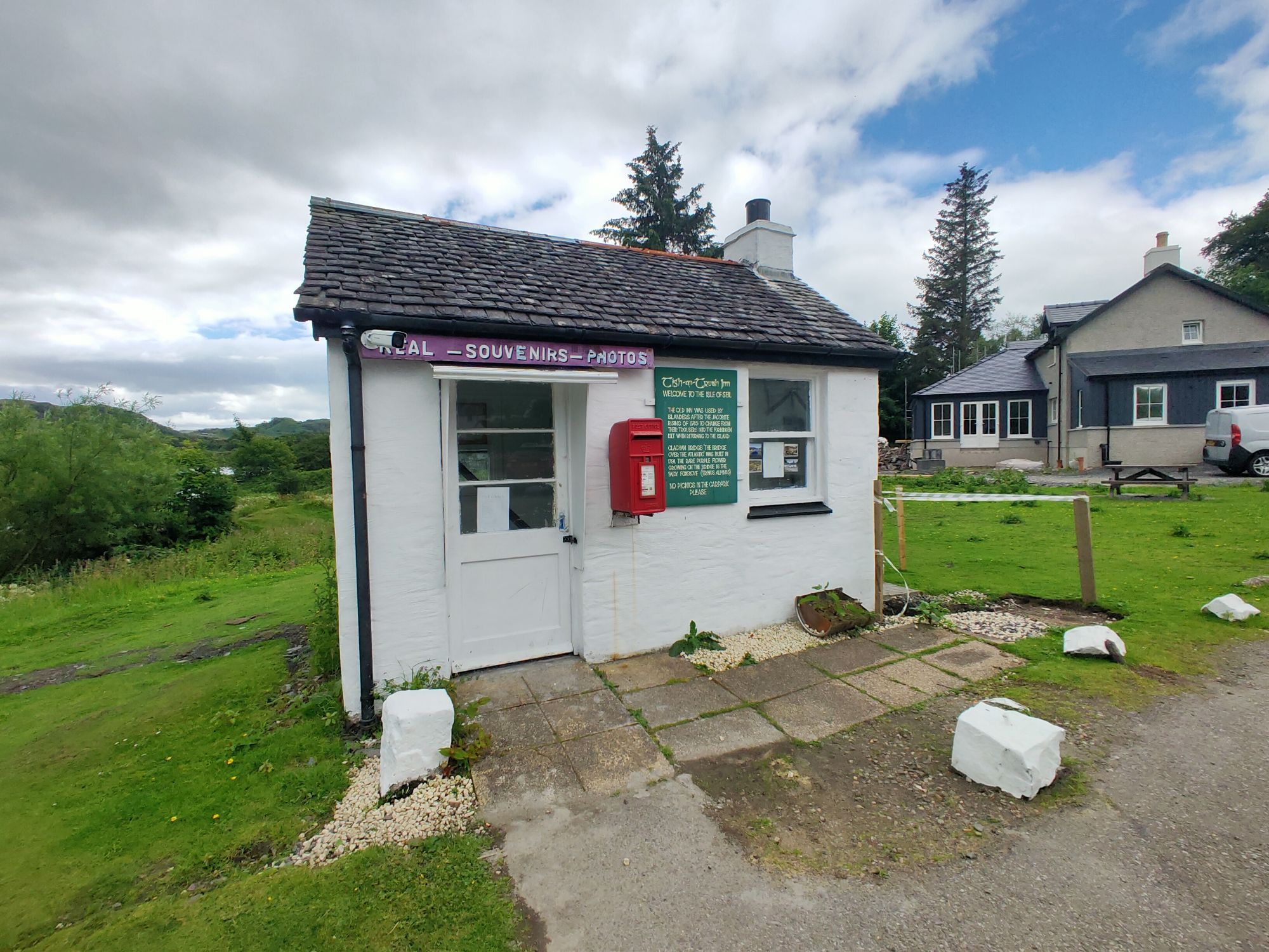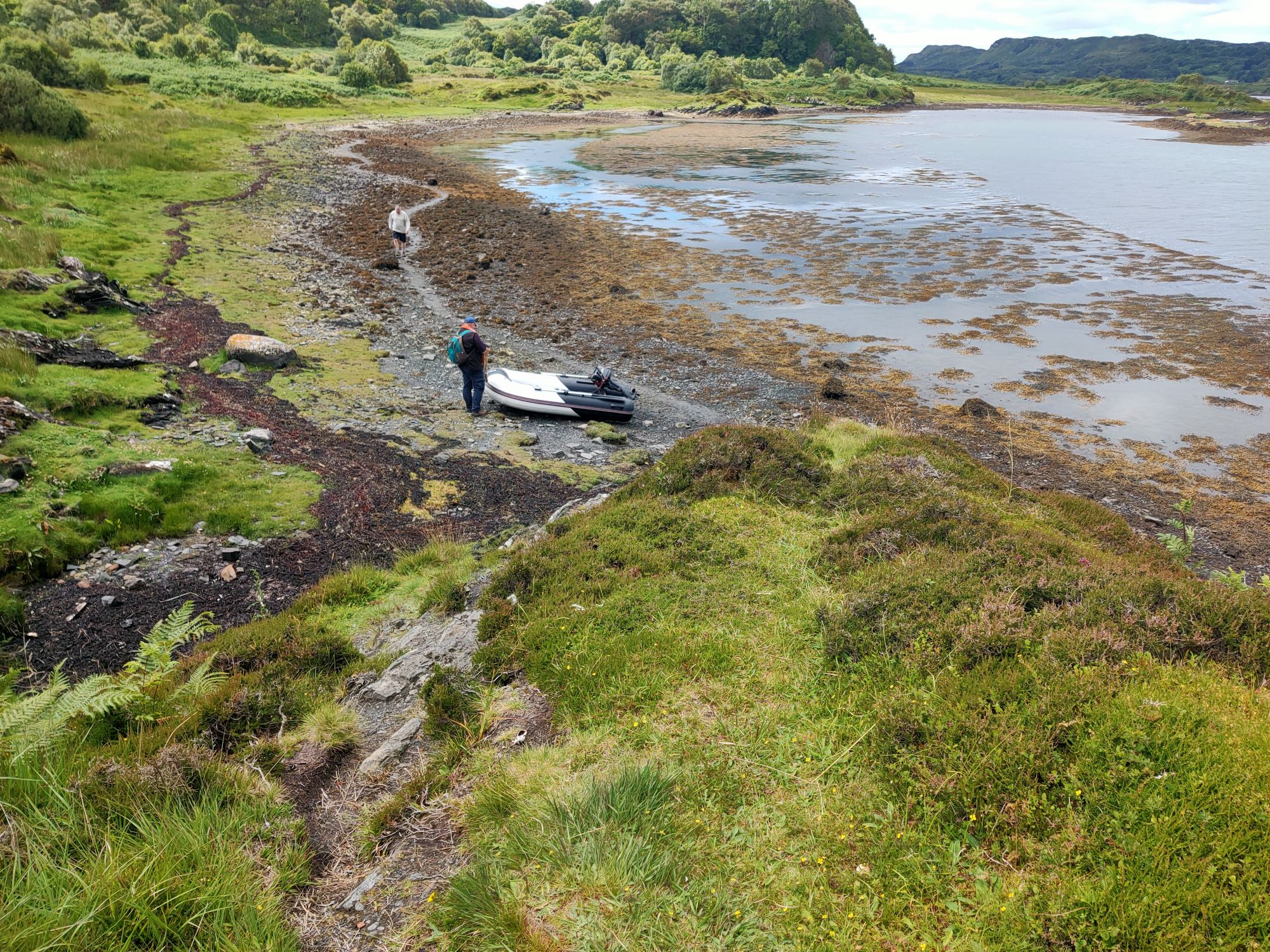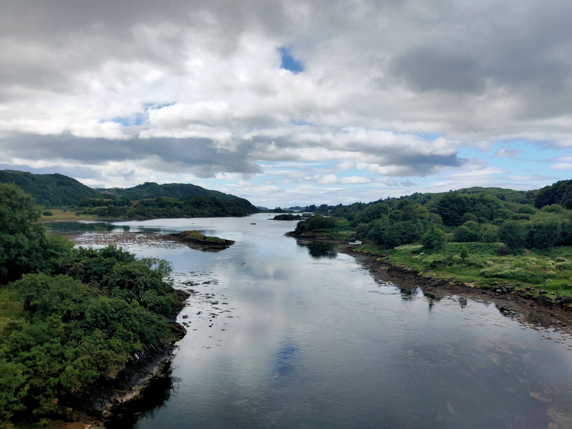 We launched the dinghy and headed ashore., the early morning blue skies were ominously clouding over. There was an adventure to be had the other side of Seil Island to the east of the anchorage. The well trodden path lead over the hill (the highest point in Seil Island is 83m and this wasn’t it), then down amongst the trees to Tigh an Truish. This was reputedly the place where the Scots exchanged their banned kilts for trousers before venturing further onto the mainland. The pub doesn’t open its doors til noon and wasn’t our goal. This morning we intended to cross the Atlantic! In fact we crossed it twice on foot, stopping to look at the rare fairy foxgloves which grow on the Clachan Bridge but sadly were past their best now.