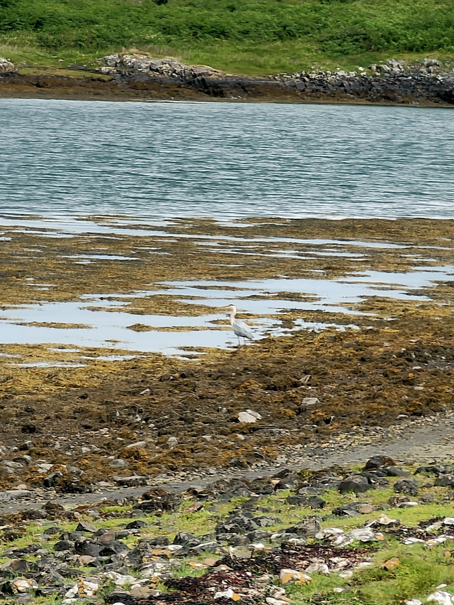 After our gentle crossings we strolled through the village in search of views across the Sound of Clachan before retracing our steps back to the dinghy. Further along the western islands’ shore, towards the top of Eileann nam Beathach, were seals, several with their young pups beside them. They lifted their heads warily as the dinghy approached, we hurried away again so as not to disturb. A brief but rather wet trip then took us to the top of Clachan Sound for a quick glimpse of the distant bridge. The tide was swilling in and threatened to carry us south with it, the narrow sound is very shallow and there’s also a lot of long thin weed lying in wait for an outboard propeller plus we didn’t fancy a trip back around the outside. Back on Temptress the cloud cleared and for an hour or two we had warm sunshine. Just four boats are left, the only noises the squeaky oystercatchers and the occasional snort of a surfacing seal. A heron stalks the bank, peering intently into the seaweed fringe of the islands.