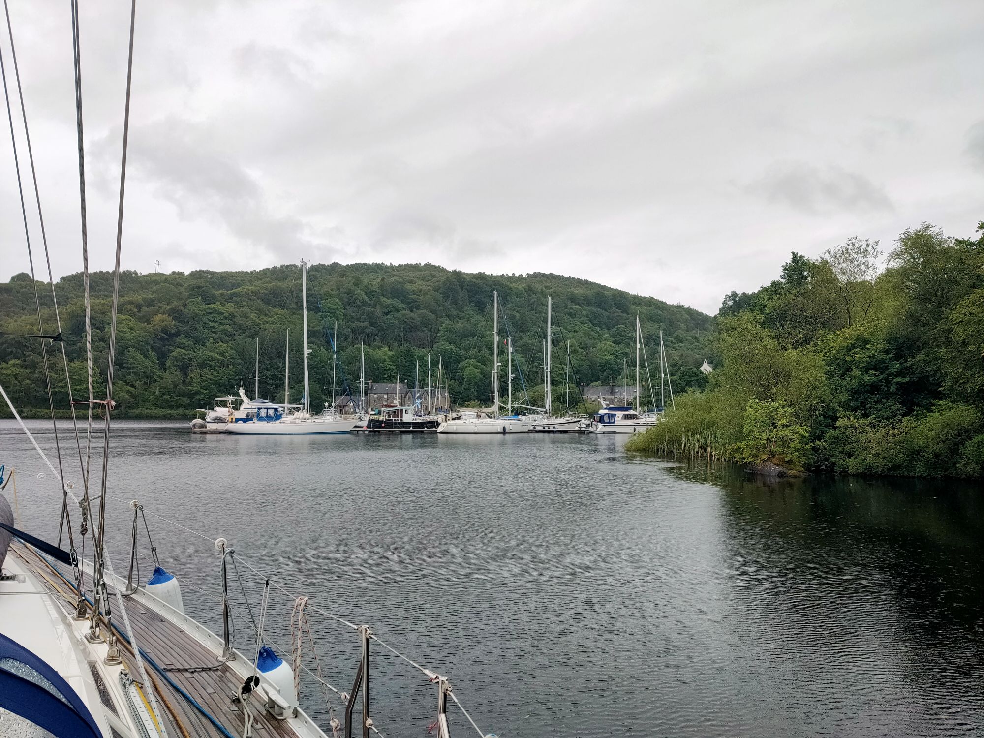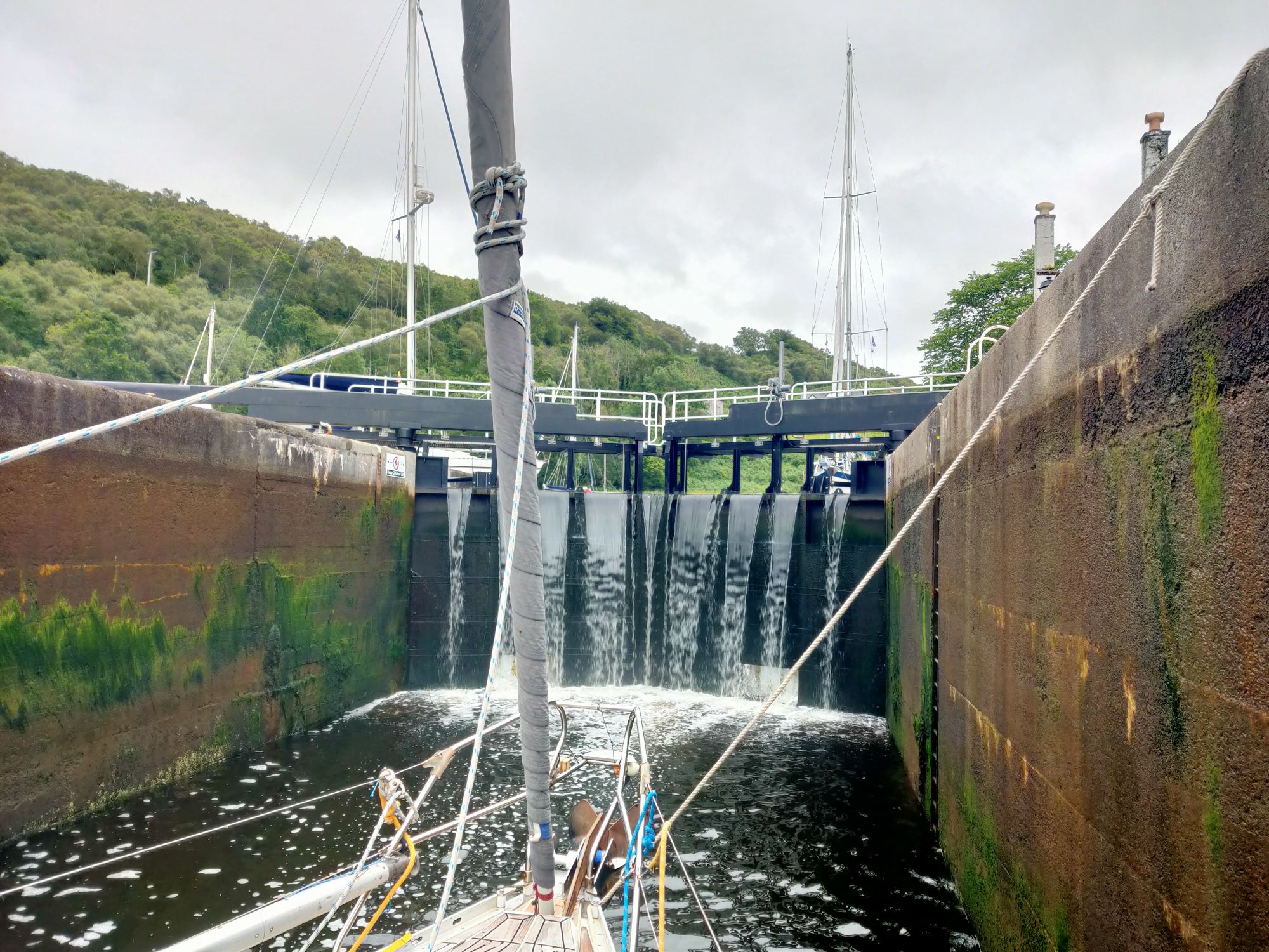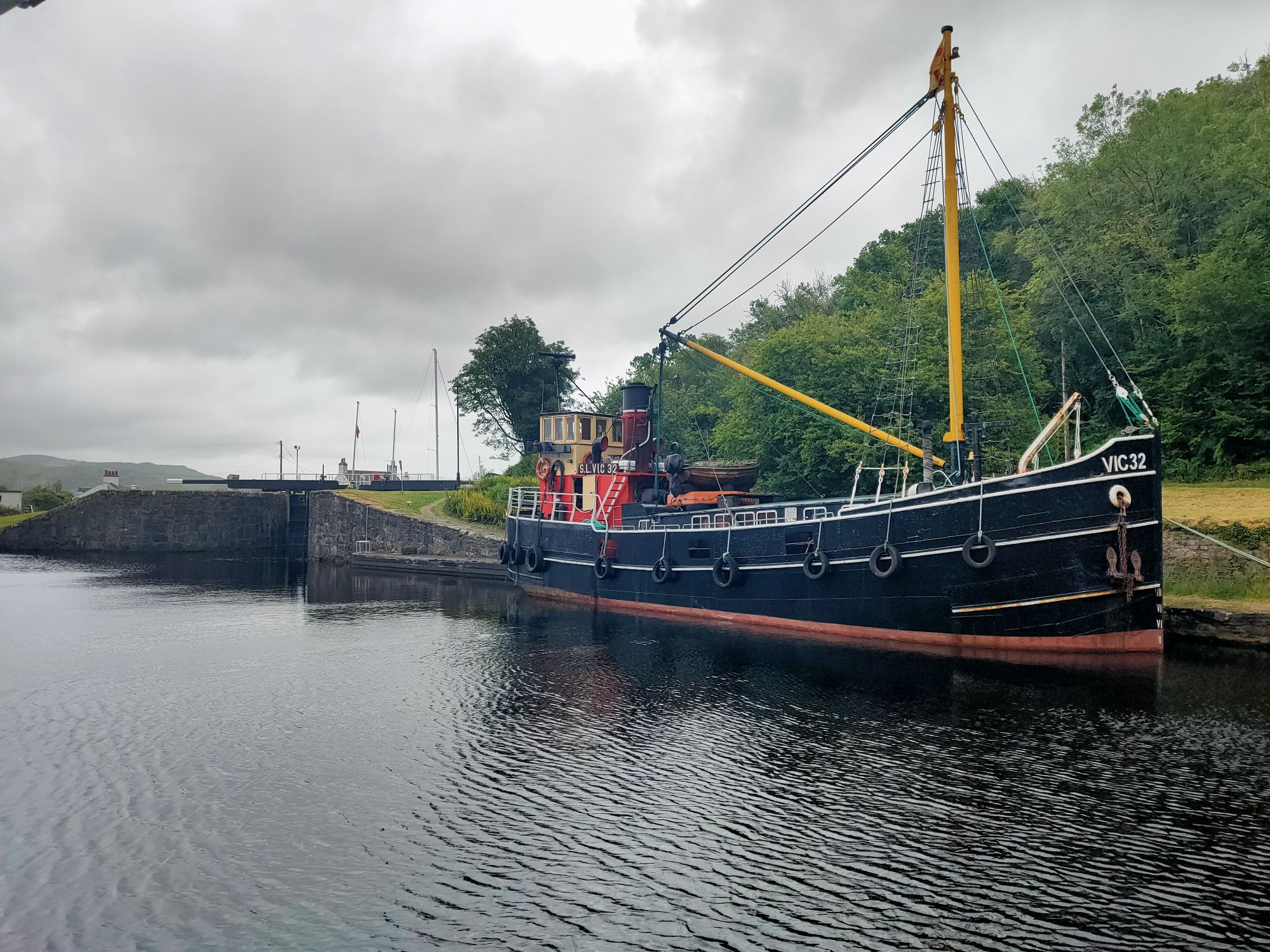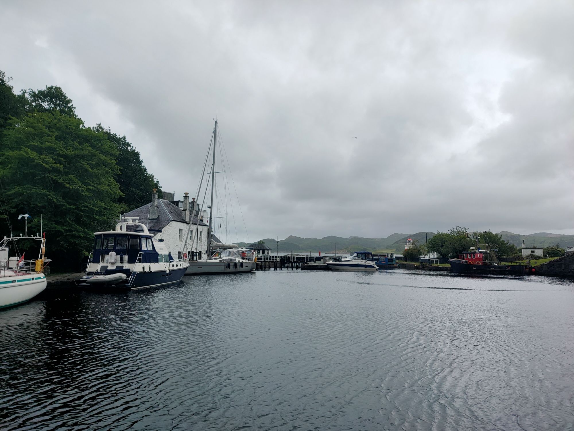 So far Temptress has covered 238 nautical miles since leaving Bangor. In the past ten days, we’ve had five nights at anchor and five in Tobermory. Now we are about to spend four in fresh water. It was a short two mile motor from our overnight anchorage to the sealock at Crinan. The gates were open so in we popped, well fendered down both sides, long lines with loops ready to be handed up to the welcoming Scottish Canals lady. A friendly face on the other side of the lock too once we’d risen enough to be seen. Grant a friend late of Bangor had reached Crinan via the canal on his singlehanded motorboat adventure. He and a friend came over for coffee and a chat before we headed to the office to pay for our canal licence. Then a short walk up to the chandlery to buy milk (in glass bottles) and eggs before settling in for a wait, we will lock up with the next boat when it arrives and is ready to move on. The heating is on again. And as forecast, it’s now raining.