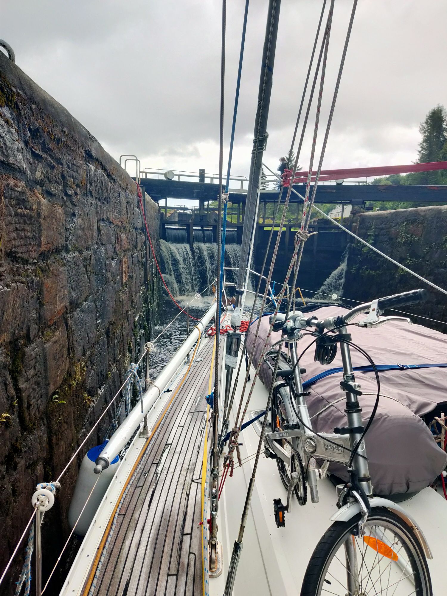 Lock six we were left to untie ourselves once the gates were open so the lock keeper could deal with the road bridge which lies across the entrance to lock five by the desolate Cairnbaan Hotel. Bridges take a while, flashing lights, barriers to stop the traffic then the bridge opens. Temptress passed through and into the final lock of the day. Once through we swiftly lowered the fenders and adjusted the lines so we could tie up on the port hand pontoon. Some six locks and we were just one nautical mile further along the canal by 11am.