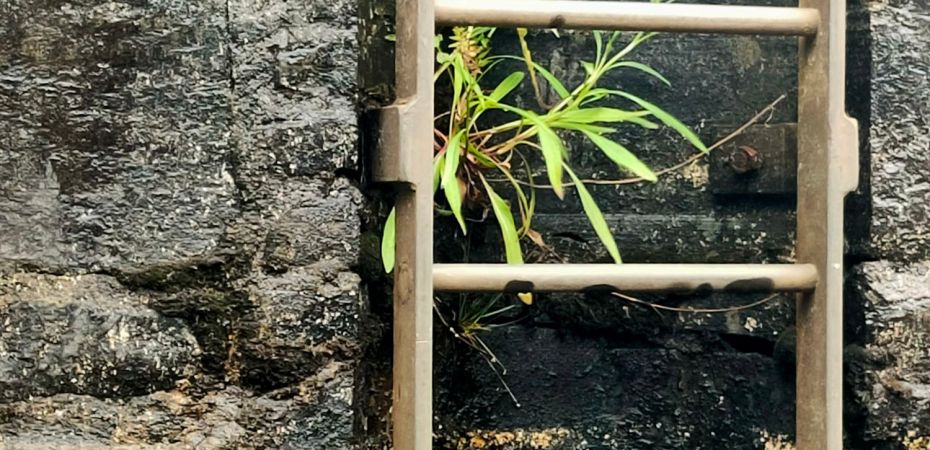 Canal pontoons aren’t floating but fixed platforms jutting out into the water so that deep draft boats can moor up without running aground, though actually Temptress often does. The canal level goes up and down for a whole variety of reasons but mainly midchannel is just deep enough for our 2.2m freshwater draft (the maximum preferred by the canal authorities). At the sides or at least by the pontoon it’s frequently 1.5m which in salt water would mean we are aground, here in the canal that’s roughly means the keel is sinking in the bottom 10cm !