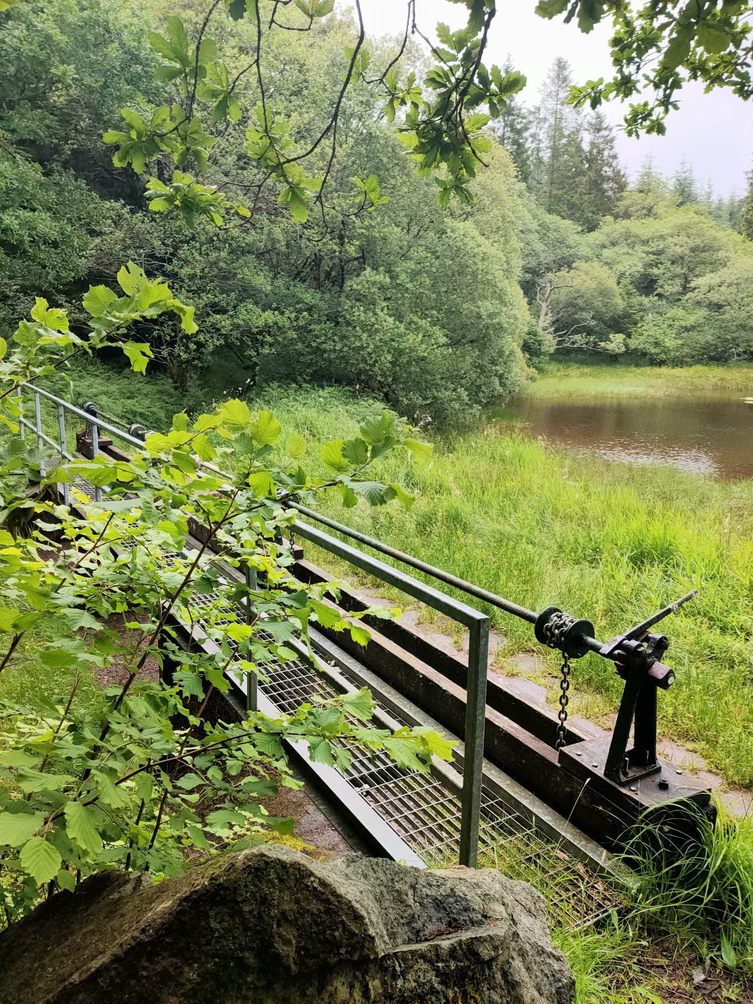 Eventually the sun came out and things started to dry. We headed off for a walk to stretch our legs. Up to the top lock and on the way back took a detour into the woods surrounding the reservoir that feeds the top pound, not that in the current weather there is any shortage of water in the canal. The path we took is a section of the Dalraida Heritage Trail. Shame the weather isn’t great for hiking as it looks an interesting path to explore more. Faced with a set of steps down through the wood and no short circular route back to the towpath we decided to retrace our steps.