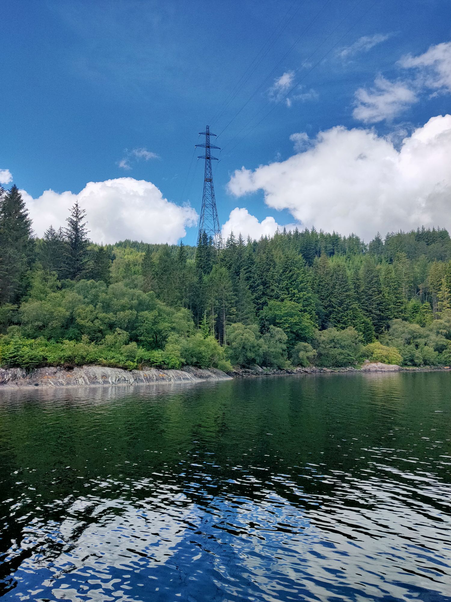 Having decided that Loch Goil wasn’t going to suit, Temptress turned round and we unfurled the jib for an at times fast sail back to Loch Long. A friend who’d sailed the area as a child suggested a couple of alternatives where we might find shelter in the northerlies. The first of those “Bute Bay” was just south of the pylons that hold the power cables stretching over Loch Long 75m above us. We found it easily enough, however steep shelving loch bed left very little shallow water meaning there was a meagre amount of swinging room, fine for a thirty footer but not for our forty seven. Despite being just above the ugly shed of the navy’s Coulport base on the opposite bank the little bay with its rocky shore and fringed with trees was very pretty but sadly not for us.