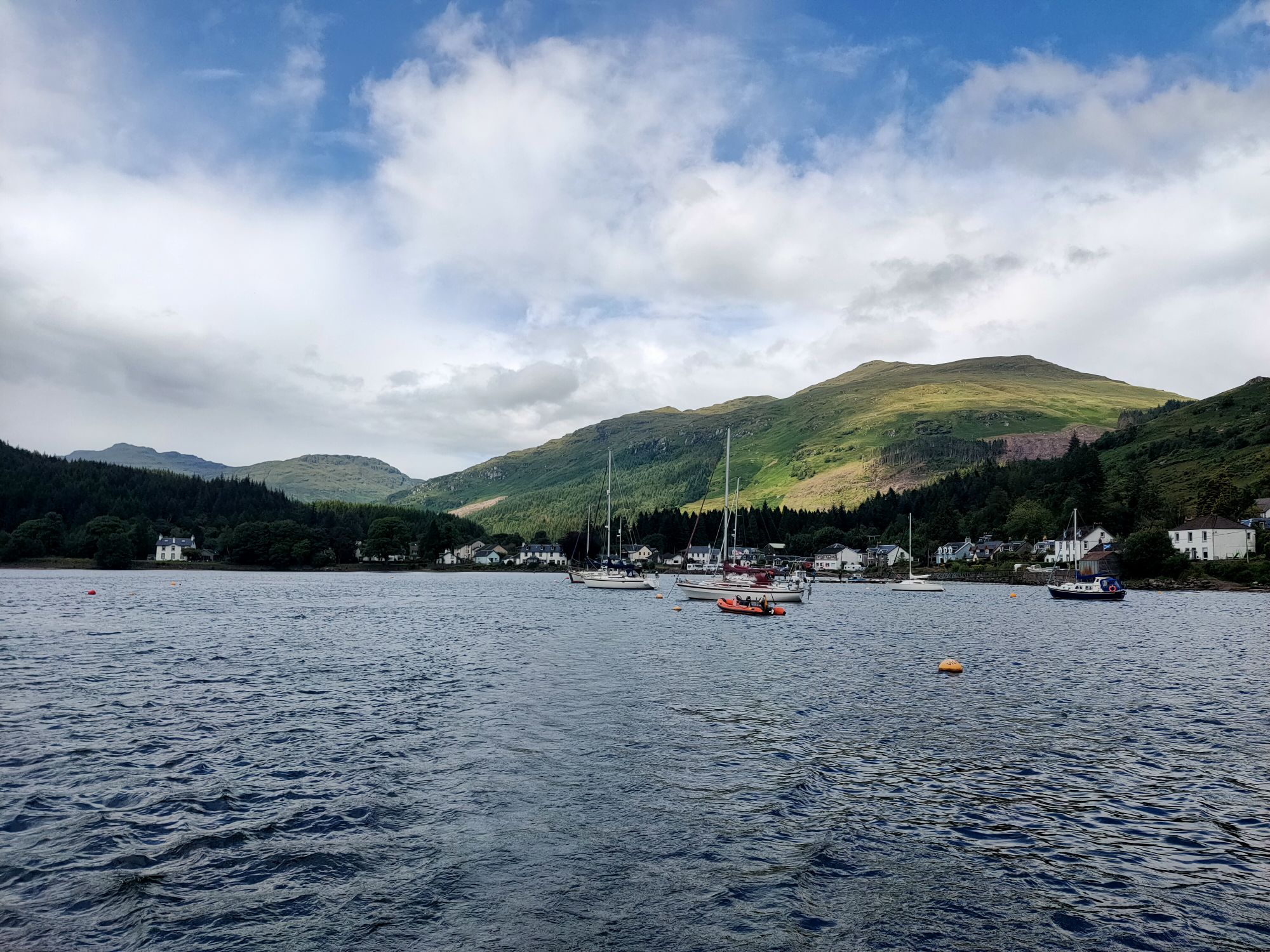 Loch Long and Loch Goil are like Norwegian fjords, deep in soaring tree clad mountains. Loch Long is precisely that and Goil branches off to the west about a third of the way up. The castle sits out on a flat promontory, around it are quite a few moorings but we found a spot to anchor just inshore of the rocks off the gravel beach in about seven metres at our second attempt. Our first was too close to the beach and a slipway. A group of divers under instruction swam past our bow heading for the rocks which even at low water have several metres of water over them. On the beach were a couple of groups of kayakers and some paddle boarders were attempting to go for a paddle. The wind had picked up over the last hour or two and was now blowing at 15 knots or more from the north west funnelled down the loch and curving around the headlands. Our pretty anchorage was rapidly becoming a lee shore off Temptress’ stern. Plans to launch the dinghy and explore the castle and village were abandoned.