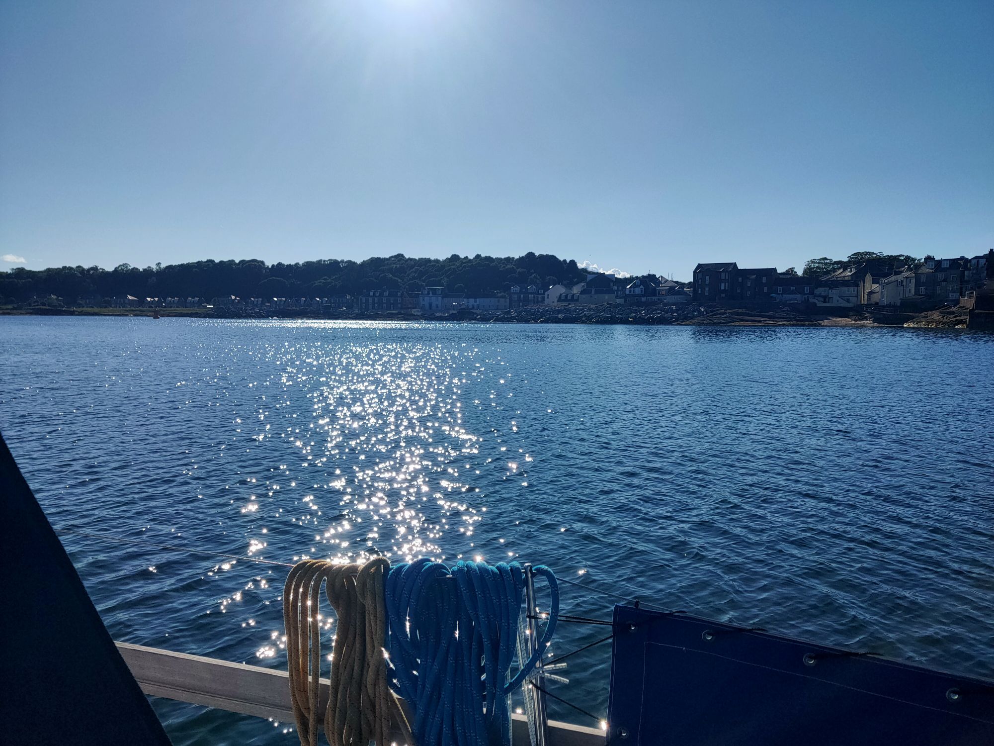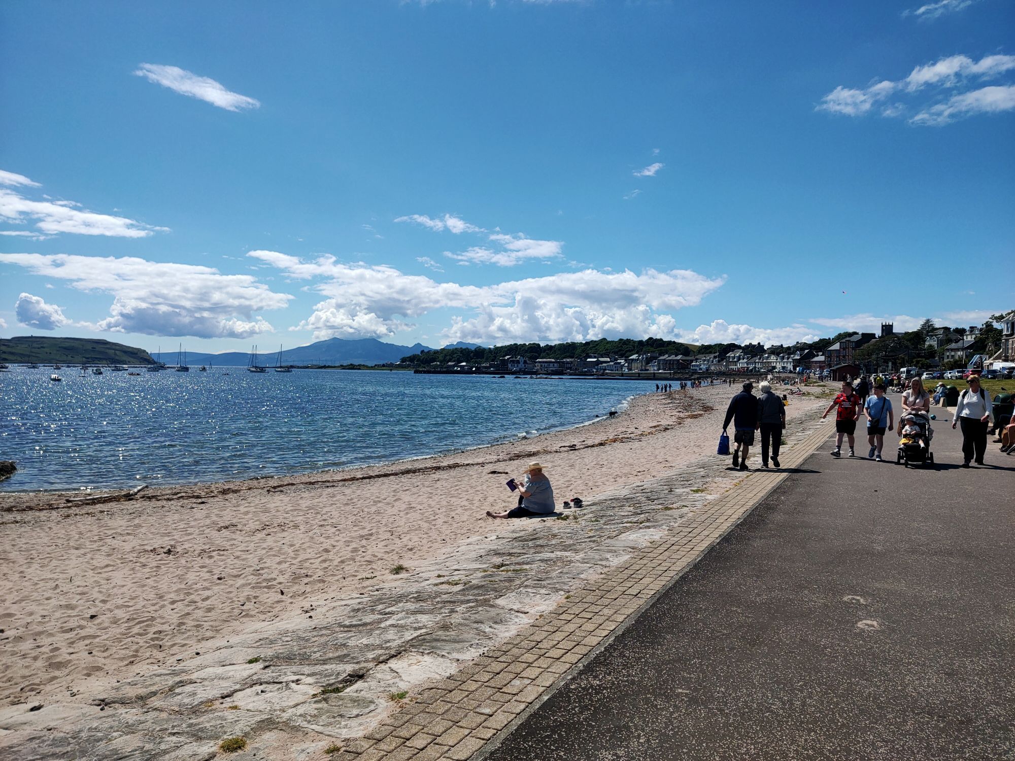 The dinghy was quickly launched and ashore in the sunshine we joined the crowds from Glasgow’s satellite towns who’d headed here for a day at the beach. Ice-creams were bought to be enjoyed as we walked the promenade eastwards along the shore. Sadly the yarn shop down near the pier is closed on Mondays so I couldn’t indulge.