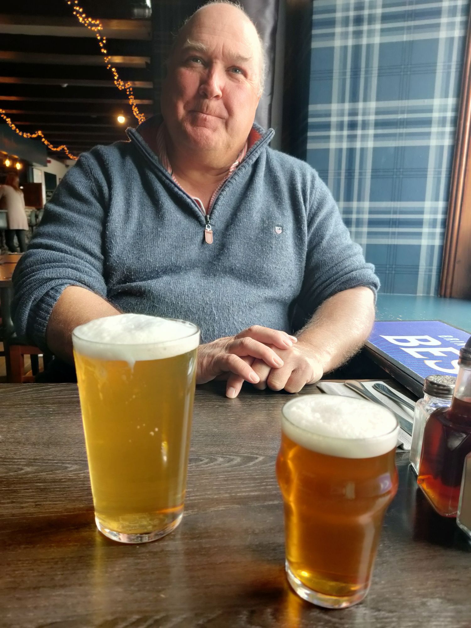 Having made our purchases we looked at the menus of both the hotel and the tavern, deciding on the latter for lunch. Dirty fries are a thing, probably a very unhealthy thing but scrumptious. Mine claimed to be a seafood fest and under the cheese and honey chilli dressing lurked a mound of scampi in batter, prawns and calamari nestled in the chips. Delicious especially when accompanied by a pint of mango ipa. The skipper had more straightforward chicken in his with a couple of pints of Hurricane Jack to wash it down. The afternoon passed in a food coma though I did manage to knit a few more centimetres of my Faroese tank top before supper.