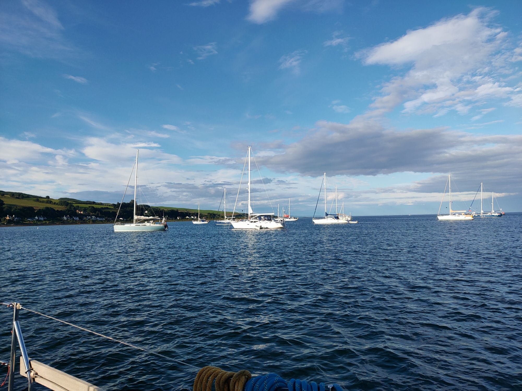Yesterday we’d debated various plans over coffee. Ultimately we need to be home before Monday for appointments. The winds are currently forecast to be light north or north westerlies for a few days. The main options are Lamlash on the east coast of Arran or Campbeltown on the east of the Mull of Kintyre. As Lamlash is very slightly closer to Millport we decided on the anchorage to the north of the visitor moorings there. It’s deep but not quite as lacking space as the Imray charts would suggest, the Antares survey shows a much wider shelf before the bottom of the harbour drops away. We dropped the hook at low water in around eight metres, by the time we’d settled back on the chain Temptress was in ten or twelve which rose to around fifteen later. Too late we read of the bottom being foul with old moorings, we’ll solve that one later if it proves a problem.